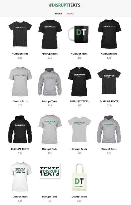 Show your support for #DisruptTexts work by purchasing official gear from our storefront on TeeSpring.com. All proceeds will be used to fund operating expenses for the website, professional development materials, and other costs associated with this endeavor. We appreciate your support as we work towards more inclusive, equitable curricula for all our students!